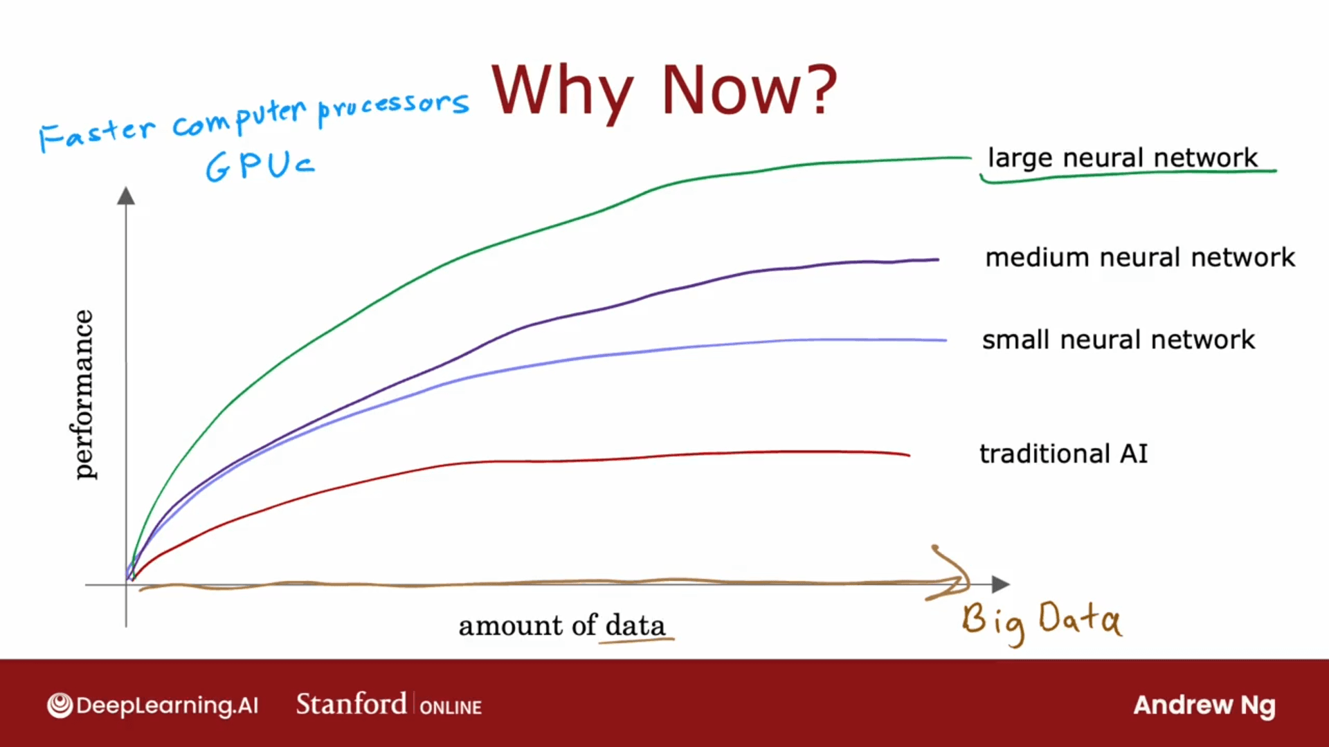 As shown in the figure below, traditional learning algorithms (like Linear or Logistic Regression) tend to plateau in performance as data volume increases. Neural networks, especially larger ones, continue to improve as more data is provided.